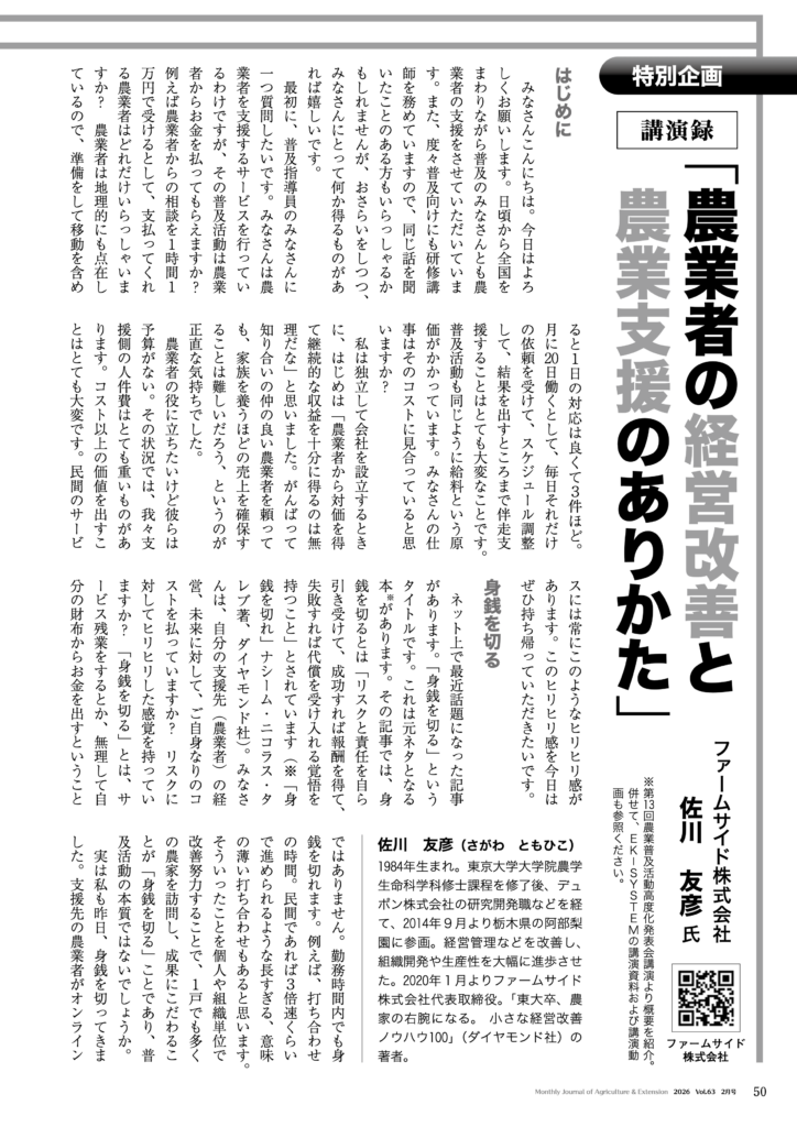 『技術と普及 2月号』掲載 2026/02/14 昨年登壇させていただいた、農業普及活動高度化発表大会の内容を『技術と普及 2月号』に掲載いただきました。編集部の許可を得て、冒頭部分を掲載いたします。ご覧いただけると幸いです。 詳細はこちら【2026年2月号】第13回農業普及活動高度化全国研究大会(前編)